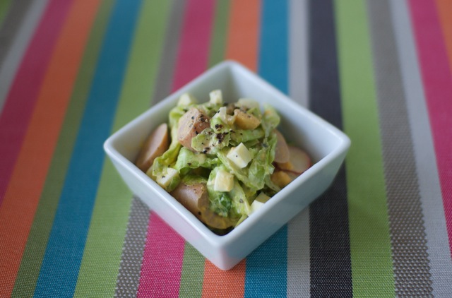 春キャベツとソーセージとゆで卵をマヨネーズとマスタードで和えました。胡椒をたーっぷり使うと、よりおいしいです。