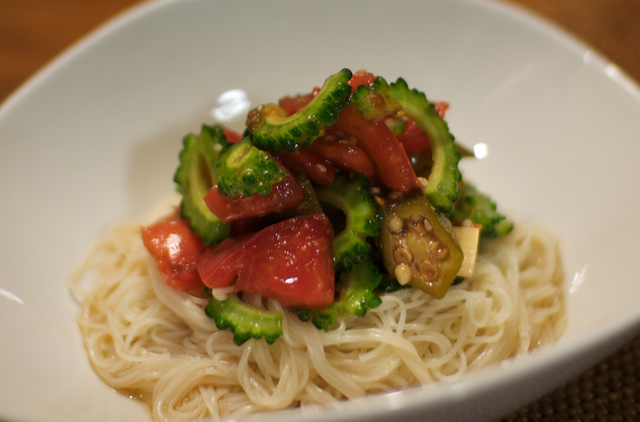 トマト・ゴーヤ・オクラの甘酢和えのせ素麺