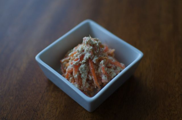 八百屋さんでおいしそうな人参をみつけたので、「人参をたっぷり使った一品を作ろう!」と思い作りました。 千切りして塩ゆでした人参と、しっかり水切りした絹ごし豆腐・練りゴマ・塩・薄口醤油・砂糖を和えます。まろやかで、本当に美味しいです。